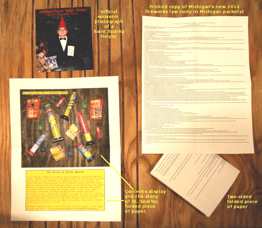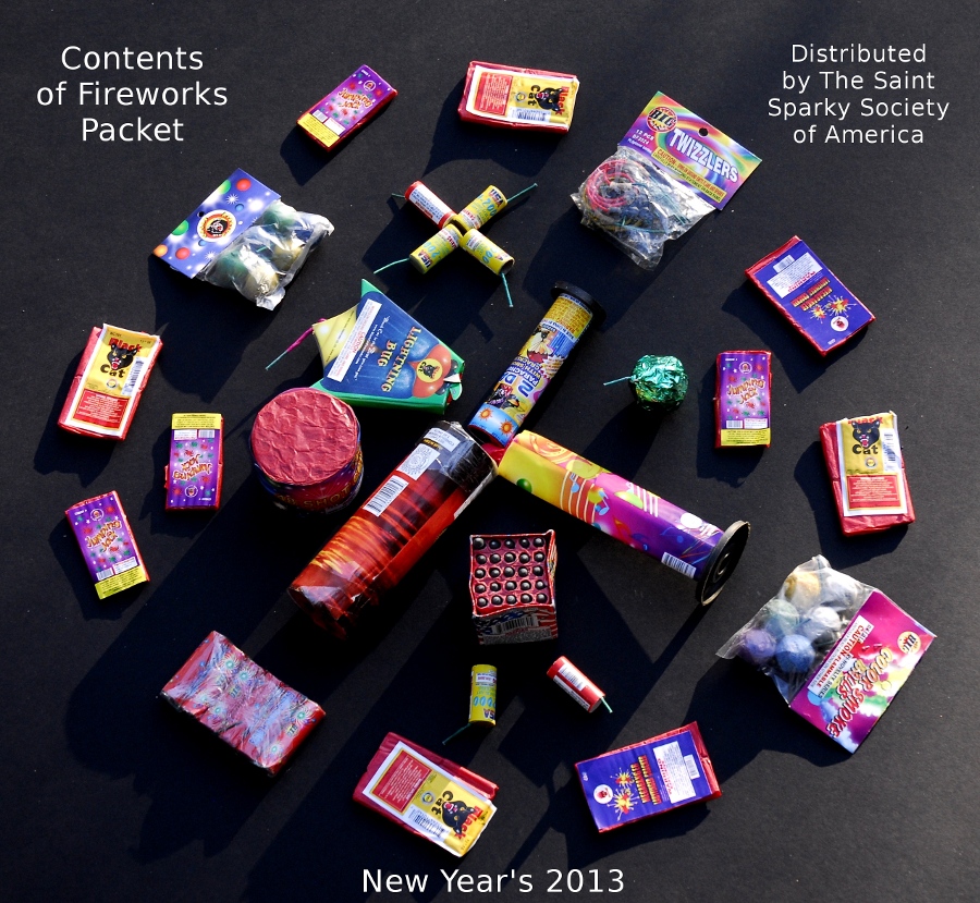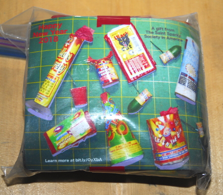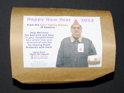 Top and side view of the St. Sparky Society fireworks packet for New Year's Eve 2012.