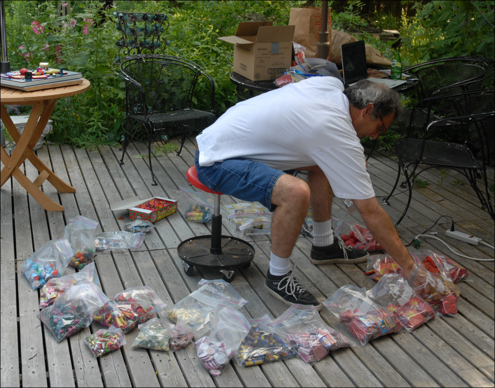 Round and round we go -- a Saint Sparky Helper bagging fireworks.