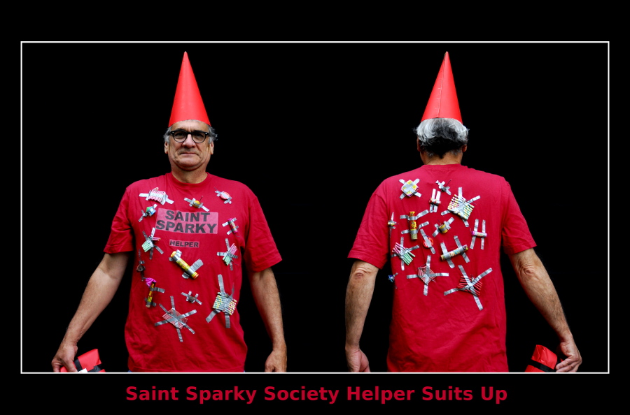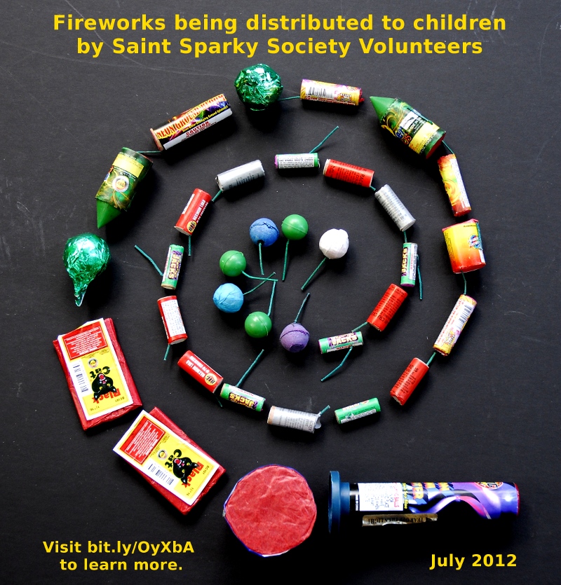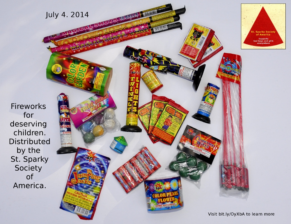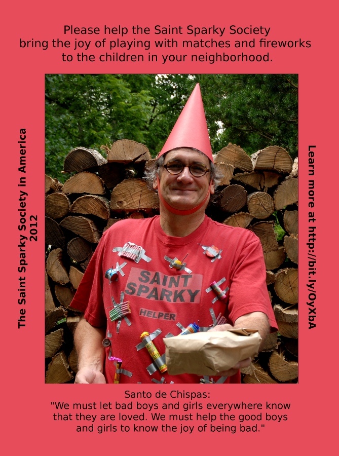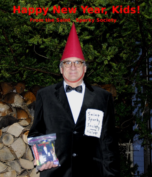 Saint Sparky Society Helpers distribute fireworks to bad girls and boys during the winter holidays.
