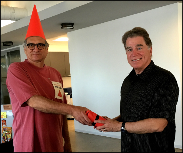 This Year's St. Sparky Society President, Allen Bukoff, Handing Out a Fireworks Packet to This Year's Poster Boy, Jerry Burton.