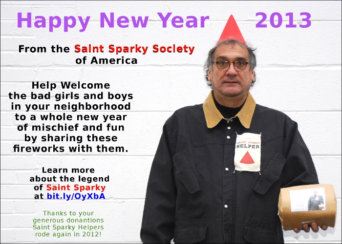 New Year's Eve 2012 Once again your generous donations have helped the St. Sparky Society bring New Year's fireworks to many deserving bad boys and bad girls!